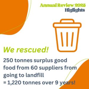 We are proud to reflect on what we’ve achieved and excited about what’s to come. Working with our volunteers, suppliers and community partners we have made a positive impact. Thanks as well to our funders and all the donations received through the year, we appreciate every HOUR, every POUND and every KILO of surplus food we receive.